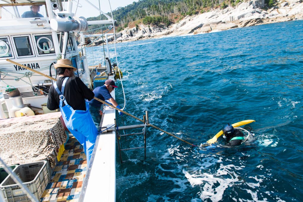 目の前に広がる青く澄んだ女川の海、そのもとで少しずつ作品作りが進んでいます。