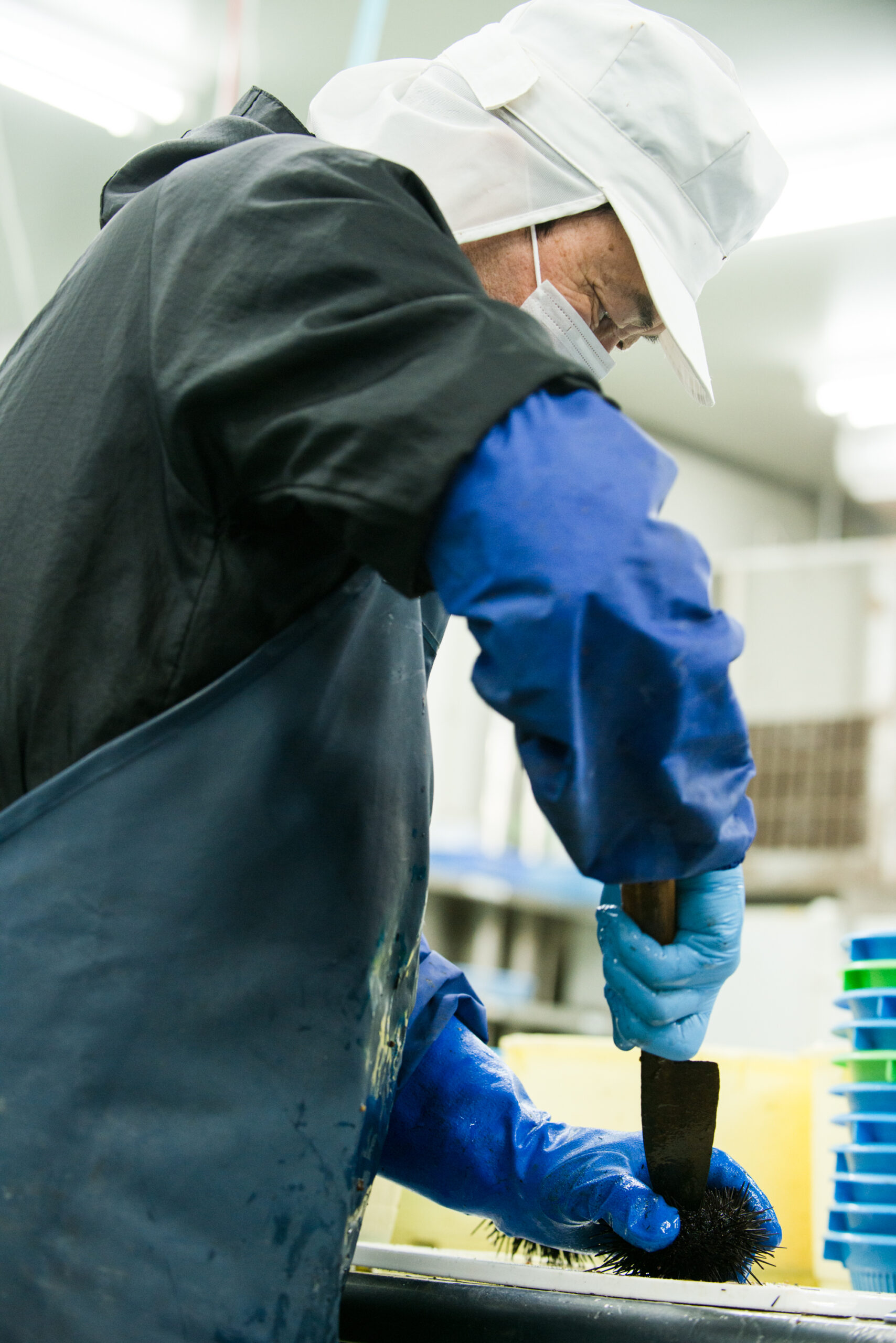 今の時期(2月~9月)「生食処理室」というところで、「板うに」や「パックうに」にするためにむき身状態になったうにの身を並べる作業を4人でやっていてそのうちの一人が私です。繁忙期(6月・7月)の特に週末にお客様からのご注文が集中し、早出勤務(6:30~、女川の朝日はすごく幻想的です)もあるのですが、一次加工室の工員さんも含め全員で協力して注文数全数をやり遂げたときに「次も頑張ろう!」という気持ちになります。